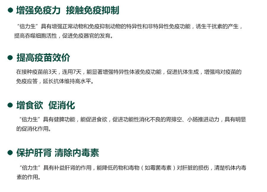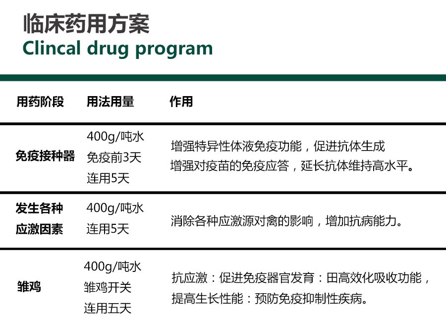 用于應激綜合征、免疫力低下及免疫抑制性疾病、 配合疫苗使用,增強疫苗免疫效果。