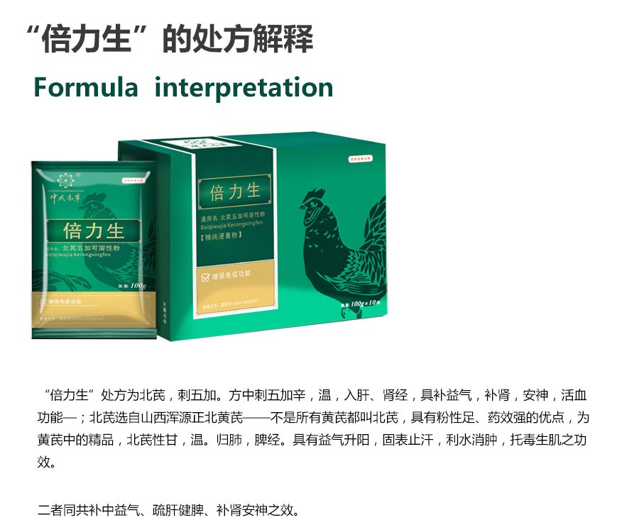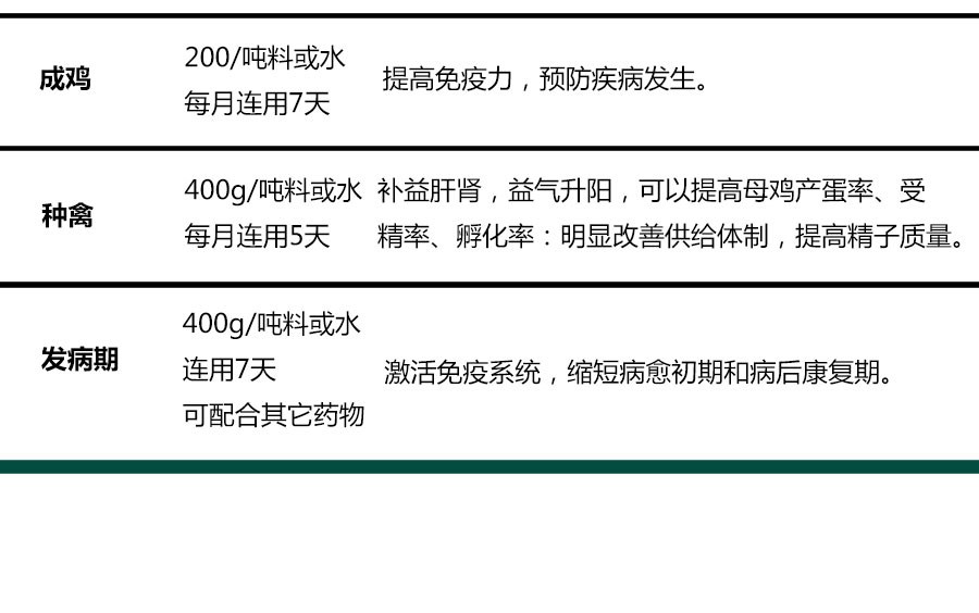 【處方】黃芪、刺五加。 【性狀】本品為棕黃色至棕褐色粉末;味甜,微苦。 【功能】增強動物機體免疫功能。 【主治】雞免疫功能低下。 【用法用量】 混飲,每1000公斤水中添加200g; 混飼,每1000公斤飼料添加300g。 病情較為嚴重時可酌情加量或遵醫囑。
