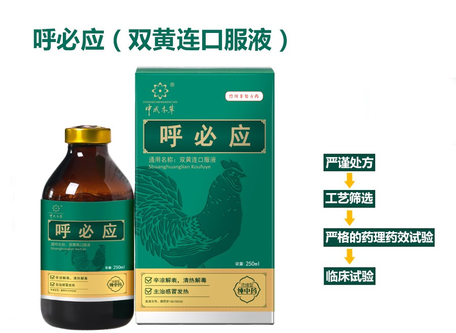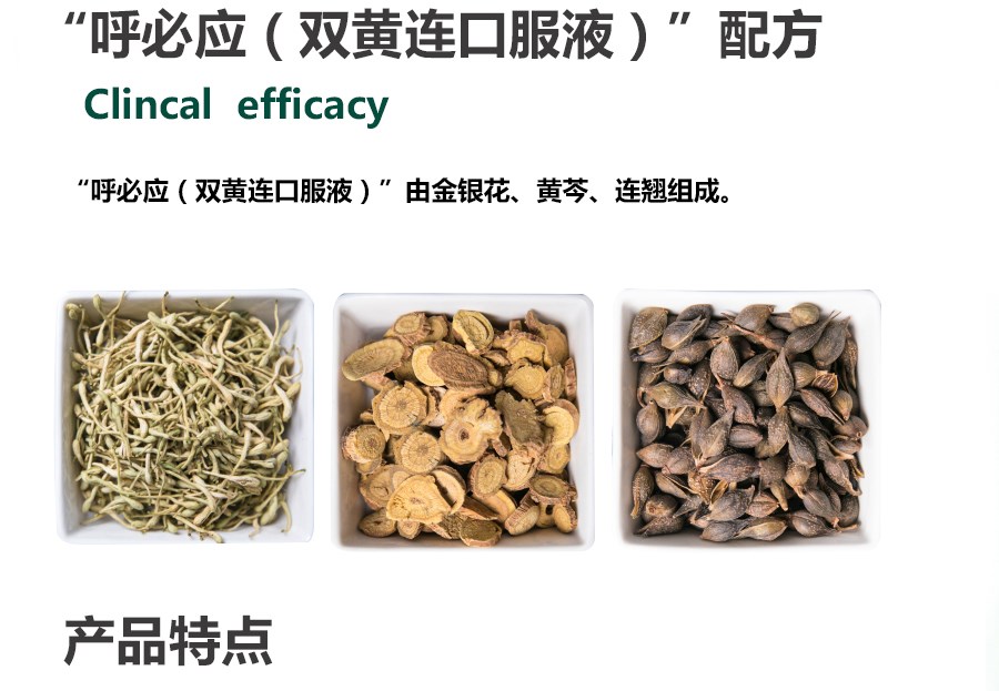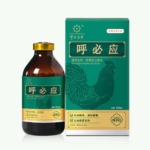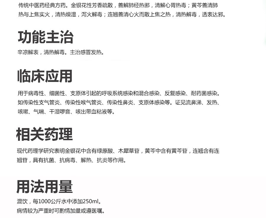 【處方】 金銀花、黃芩、連翹。 【性狀】 本品為棕紅色的澄清液體;微苦。 【功能】 辛涼解表,清熱解毒。 【主治】 感冒發熱。 【用法與用量】 混飲,每1000公斤水中添加250ml。 病情較為嚴重時可酌情加量或遵醫囑。
