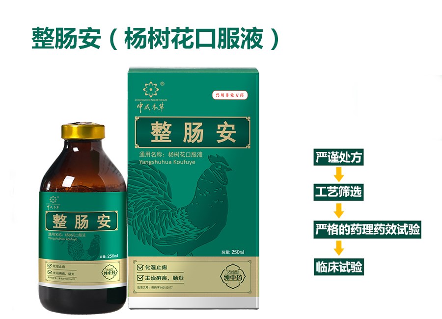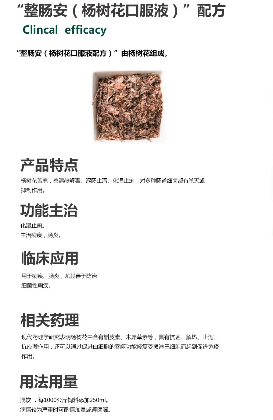 【處方】楊樹花。 【性狀】 本品為紅棕色的澄明液體。 【功能】 化濕止痢。 【主治】 痢疾,腸炎。 【用法與用量】 混飲,每1000公斤水中添加250ml。 病情較為嚴重時可酌情加量或遵醫(yī)囑。
