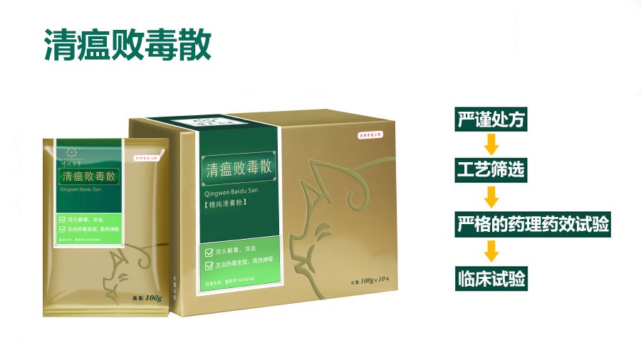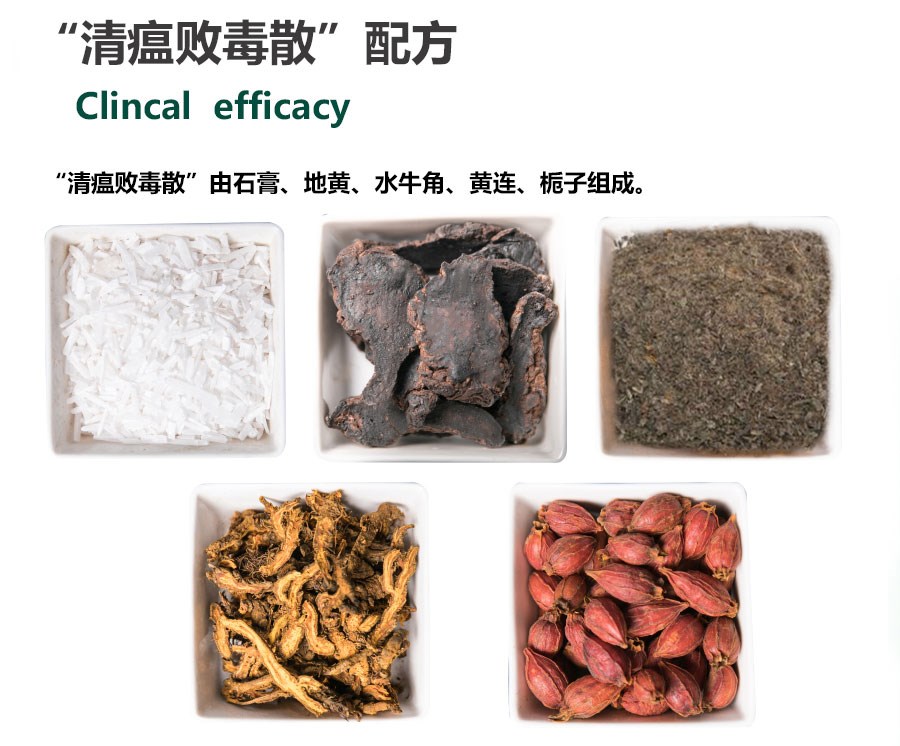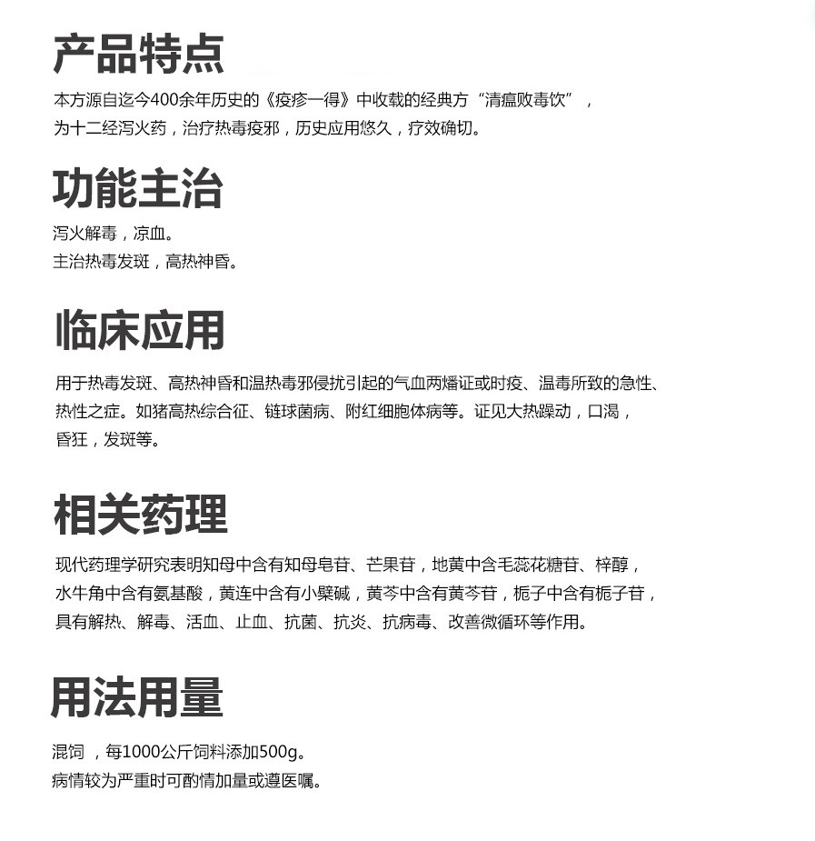 【處方】石膏、地黃、水牛角、黃連、梔子。 【性狀】本品為棕黃色至棕褐色的顆粒。 【功能】瀉火解毒,涼血。 【主治】熱毒發斑,高熱神昏。 【用法用量】 混飼,每1000公斤飼料添加400g。 病情較為嚴重時可酌情加量或遵醫囑。