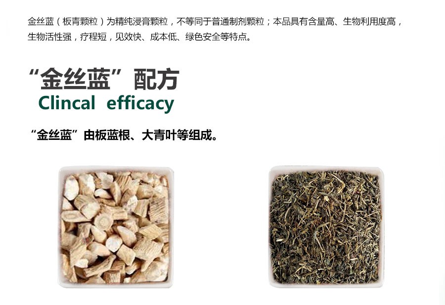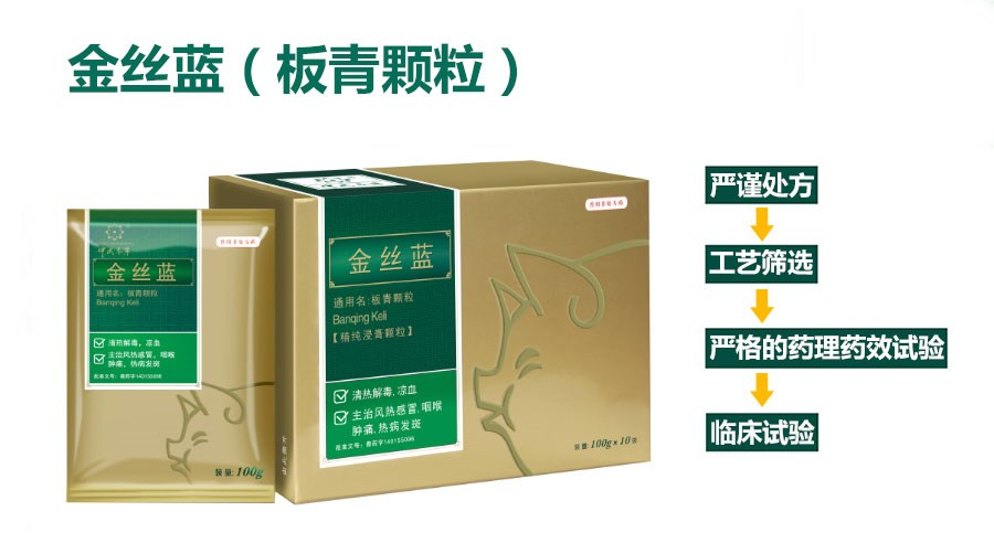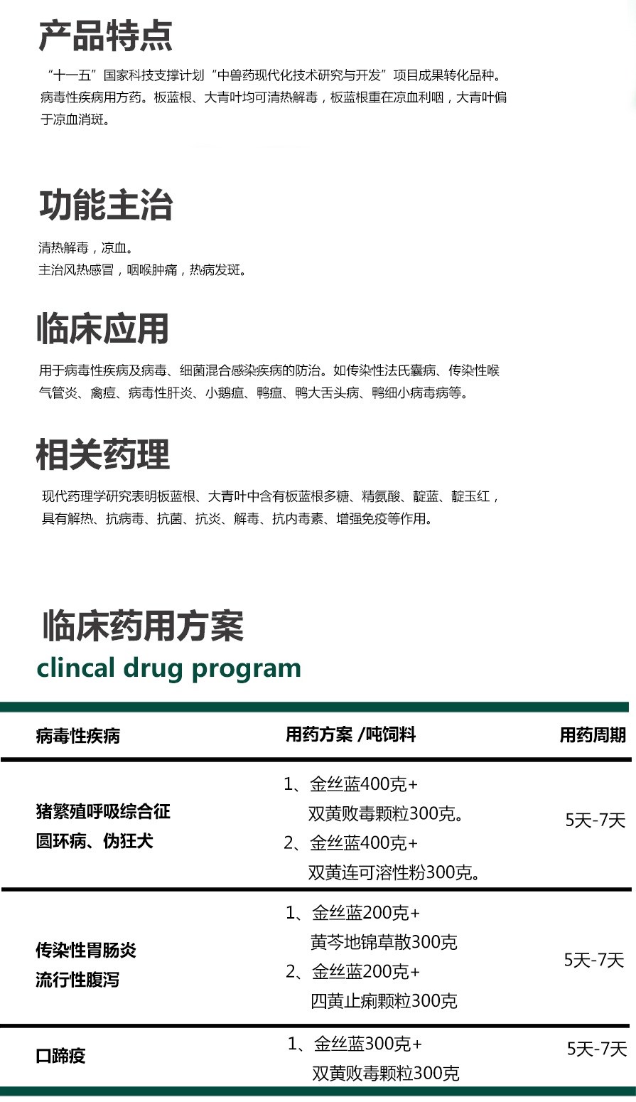 “十一五”國家科技支撐計劃“中獸藥現代化技 術研究與開發”項目成果轉化品種。 病毒性疾病用方藥。